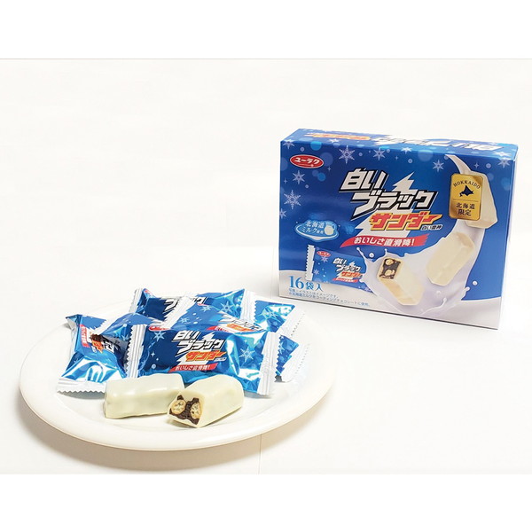 ココアクッキー&プレーンビスケットに、北海道産ミルクを使用したホワイトチョコレートを厚めにコーティングしたザクザク食感のお菓子。