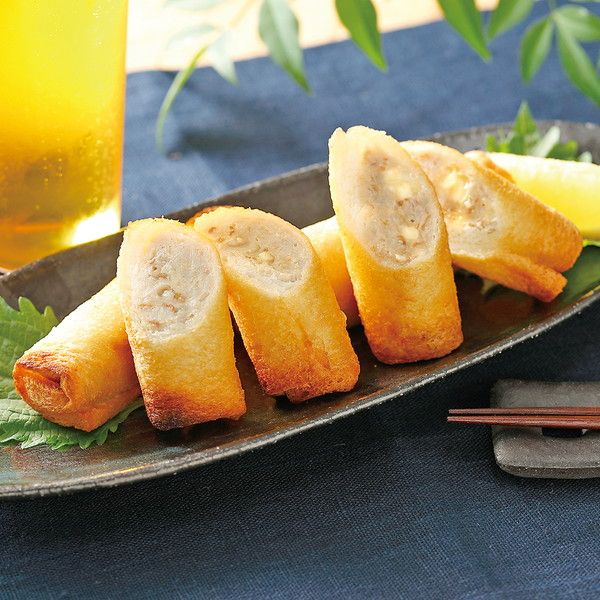 長崎産アジすり身を主原料に牛・豚ミンチ、玉ねぎを加え、パンでロール状に巻いて、油で揚げました。